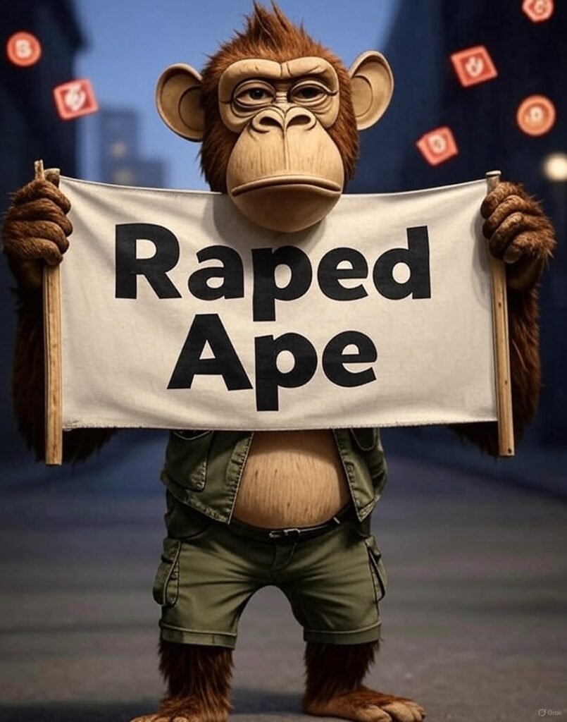 $Raped Ape ($Raped) is the coin for Apes who’ve been rekt, a hedge against shake-outs and rug pulls, and a safe haven for all fellow Apes. In this wild West crypto world, we rise together, turning losses into legends. Join the horde, stake your claim, and let’s build a future where no Ape is left behind! (“In Apes we trust.”)